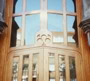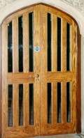 Woodwork St Martin's church has a good deal of oak timberwork as part of the original design by E B Lamb. It was felt appropriate to continue this material as part of the new design scheme.A new oak screen was designed in American oak, to provide protection to the large opening in the tower. Previously the tower opening was a rather windswept area which also suffered from pigeons and general debris. Installing the screen enabled this area to be used as a welcoming, and clean, entrance to the church. The glazing also enables visitors to glimpse something of the interior without problems of security.The carved motif immediately above the double doors echoes some of the internal details. The pair of double doors lead from the tower into the body of the church, and were also made from American oak.